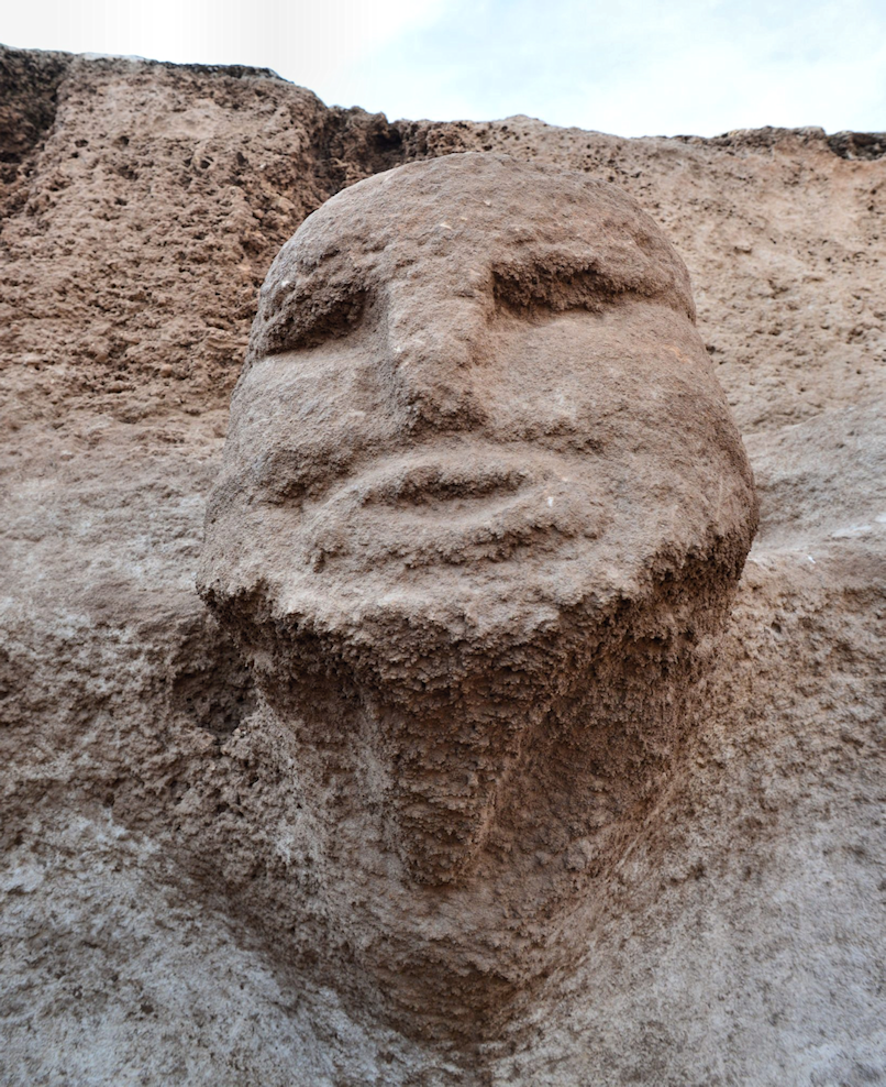 Excavations have revealed carved human faces emerging from the bedrock within circular structures. These are not loose objects. They are integrated into the architecture itself. The face looks outward from the wall, positioned where it would have been visible to anyone inside the enclosure.